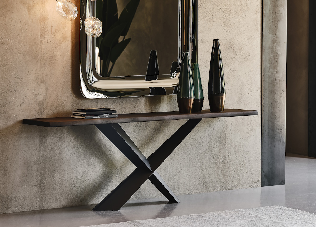 A standout feature of the Terminal console is its bold metal cross shaped base which is available in either titanium, bronze, graphite, pearl, or black embossed lacquered steel, or brushed bronze or brushed grey.