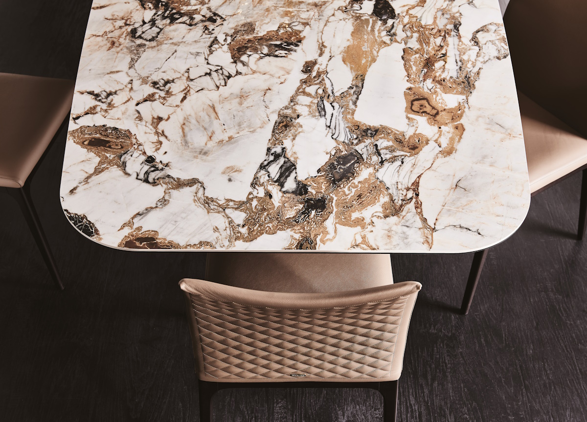 Top in ceramic Marmi Alabastro (KM02), Supreme (KM03), matt Golden Calacatta (KM05), glossy Golden Calacatta (KM06), matt Portoro (KM07), glossy Portoro (KM08), glossy Sahara Noir (KM09), Makalu (KM11), Breccia (KM12), Arenal (KM13), Corcovado (KM14), Kaindy (KM16), matt Borghini Calacatta (KM18) or glossy Borghini Calacatta (KM19). Please note that the 200cm wide x 100cm table is only available in a Portoro matt or glossy finish.