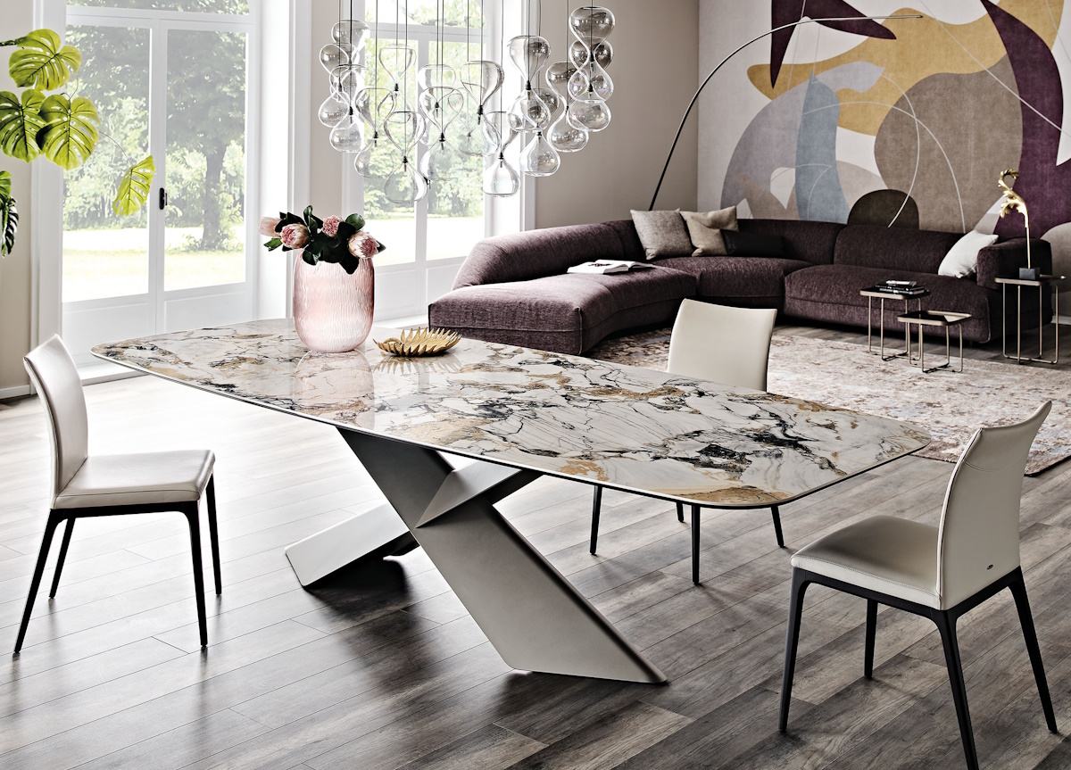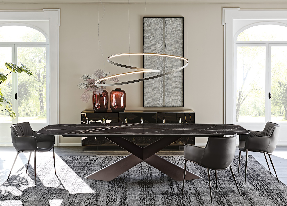 The Cattelan Italia Tyron Keramik table is made from the finest Italian materials and has a bold X shaped metal base with a table top available in several luxurious matt or glossy ceramic finishes.