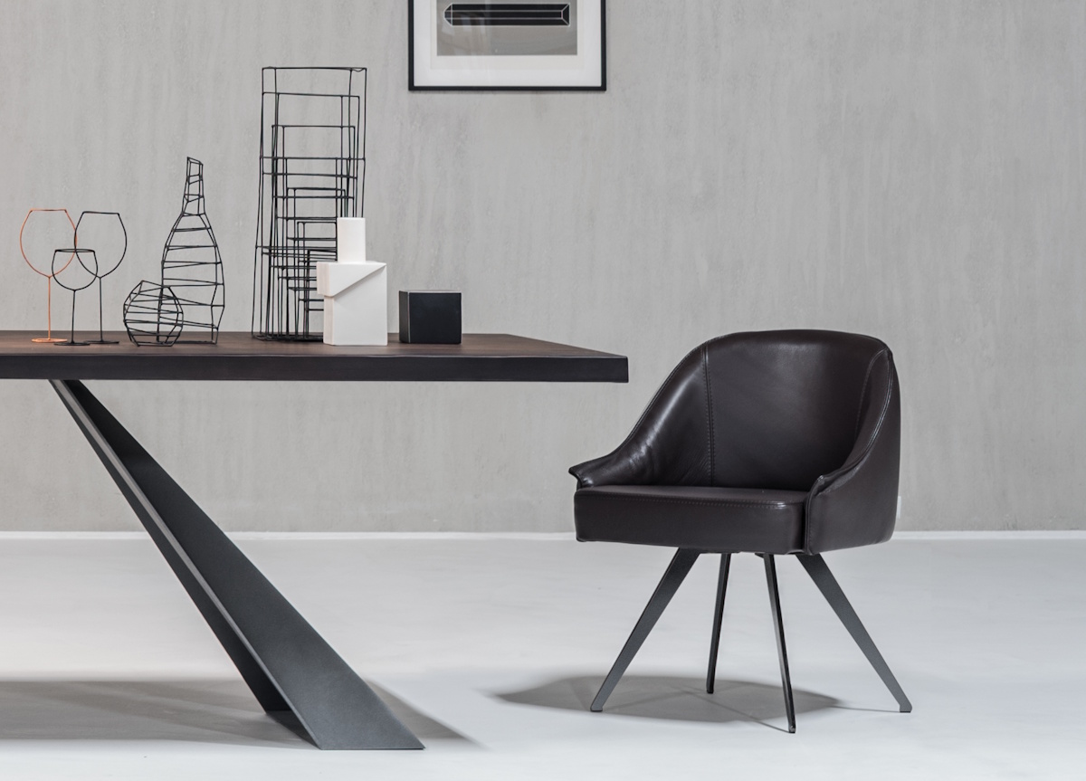 The Cierre Bohème dining chair by Stefano Conficconi has an incredibly practical 180-degree swivelling base with a return mechanism and legs in either polished chrome, or black chrome.