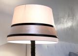 White cotton shade with sand strip, & velvet ribbon trim in black, orange, light blue, or mustard. Stem in brack braided silk rope, base in black gloss lacquer.