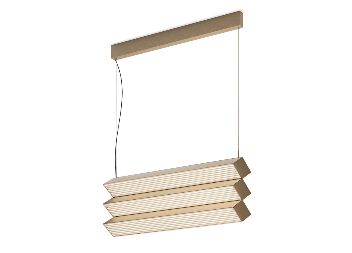 The metal frame and ceiling support can be selected in either a satin golden nickel finish or brushed bronze finish. The stylish plexiglass ribbed diffuser was chosen specifically to produce unique plays of illumination in any environment. As well as being made technically to a very high standard Stick lights its surroundings evenly and depending on the viewing angle, it creates different light effects.