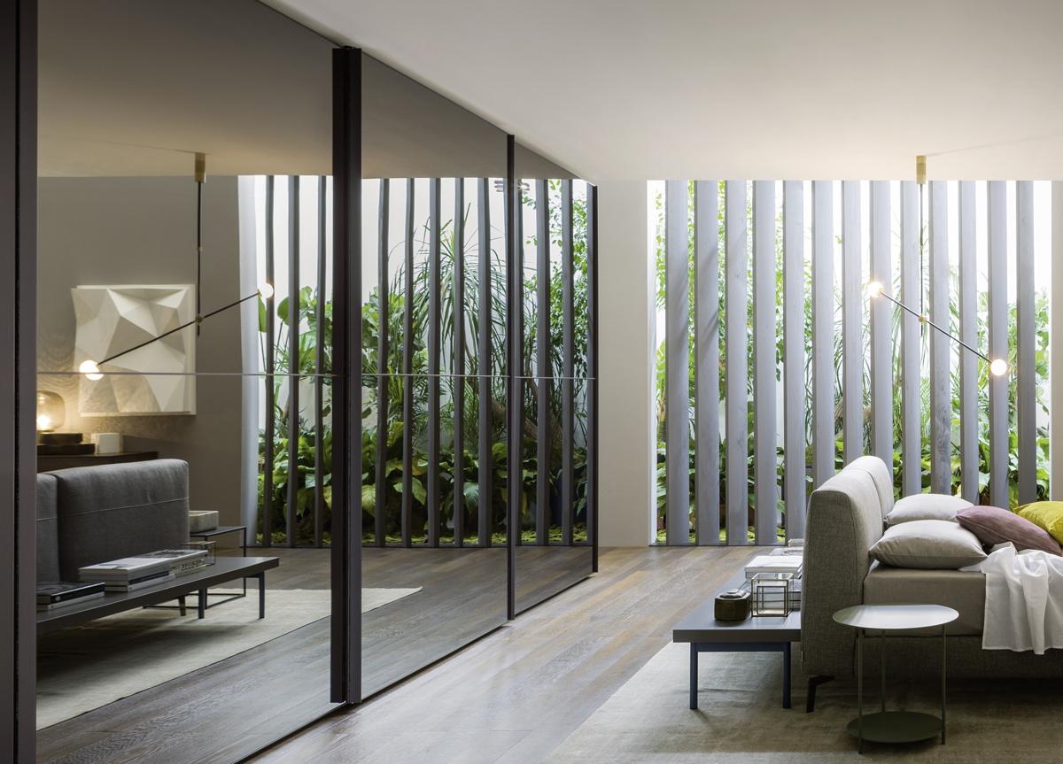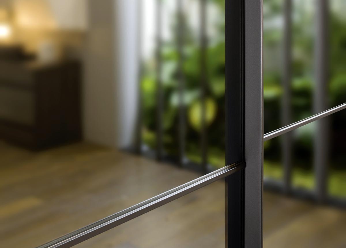 The Crystal Maxi mirrored sliding door wardrobe from Italian brand Novamobili has large mirrored glass sliding doors with a metal profile running around the edge of the door, & through the middle. The handle is part of the profile.