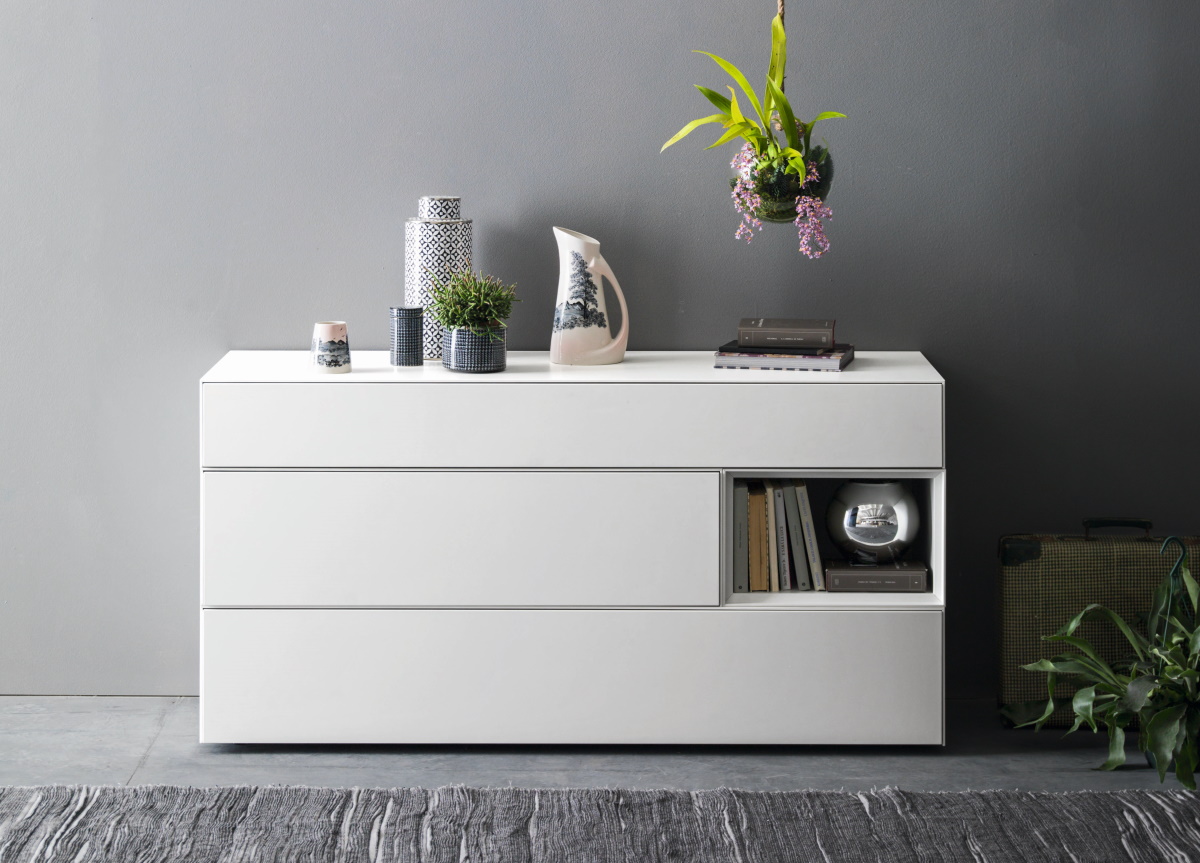 ith a sleek, slim frame and recessed angled edges on the open display area, this DaFre Fil chest of drawers is a composition of single drawer units and an open unit providing a great solution for your living room or bedroom needs. Made in Italy by Italian brand DaFre.