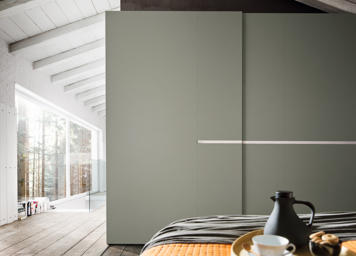 The main images show this wardrobe in a Te verde matt lacquer finish with Katy T exterior handles, in matt bianco, and a chalk pattern surfaced interior. This range also includes hinged door wardrobes - please see related products below.