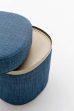 Upholstered side table/pouf with storage base and cushion lid, available in a large range of fabrics, ecoleather & leather in a choice of colours & textures. The removeable polyurethane rigid tray is lacquered in moka shine or micalised nickel.