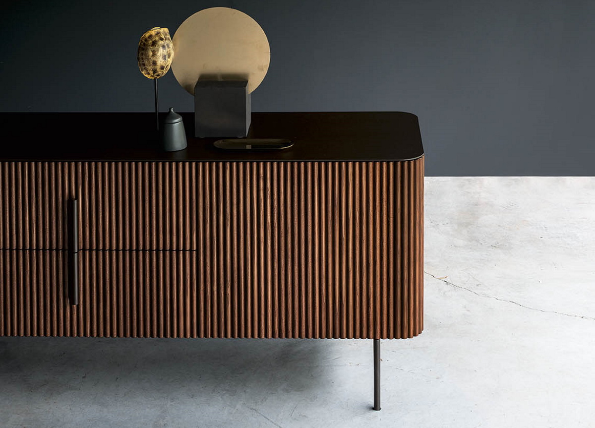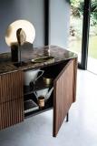 The DaFre Rigadin sideboard, designed by Gordon Guillaumier for luxury Italian brand DaFre, combines fluted walnut stained frassino ash wood with a stunning emperador marble, lava stone or elettrocol lacquered metal top.