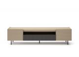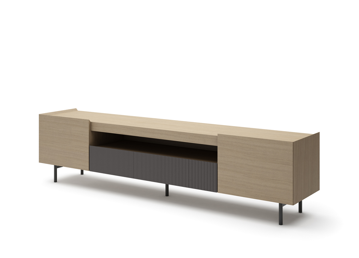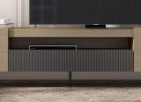 The Dunas TV unit has two open shelves for media equipment, & a Dunas waved front drawer underneath, with sleek handless doors on either side.