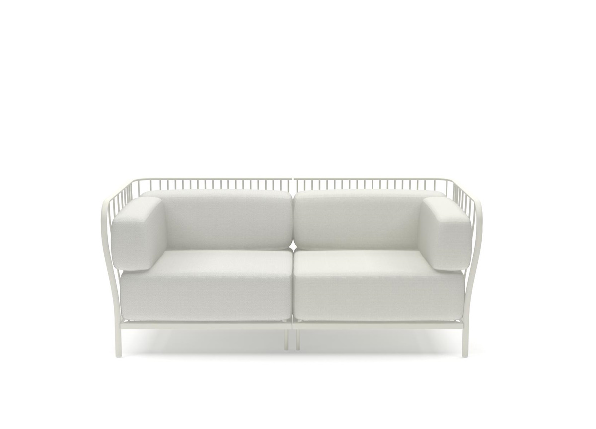 The range consists of side, central, corner and footstool modules which can be combined together to suit your own bespoke garden sofa arrangement. Each module has a fully welded frame made from galvanised steel tubes with a seat composed of galvanised rods grid welded on to a rod frame. The legs are made of tubular steel. MIG welding, degreasing and cataphoresis pre-treatment and finishing with thermosetting polyester powders give each module a weather resistant finish.