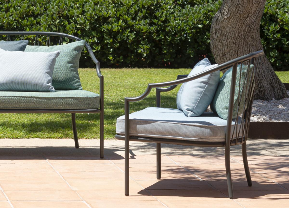The frame is available in five different colours. Standard seat cushions are made from an acrylic fabric which combines the aesthetic qualities of a luxurious fabric with the texture and feel of wool. This fabric is UV resistant, fast drying, does not stain and does not rot upon contact with water.
