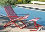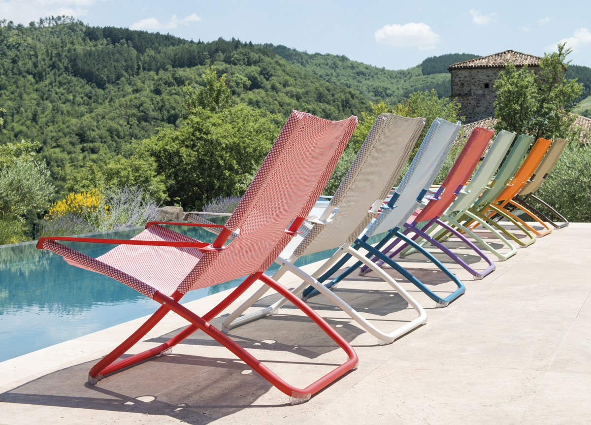 The frame is in powder coated aluminium, with a seat made from Emu Tex, which is a comfortable, technical fabric made to withstand the elements. Practically, these deck chairs are also foldable for easy storage.