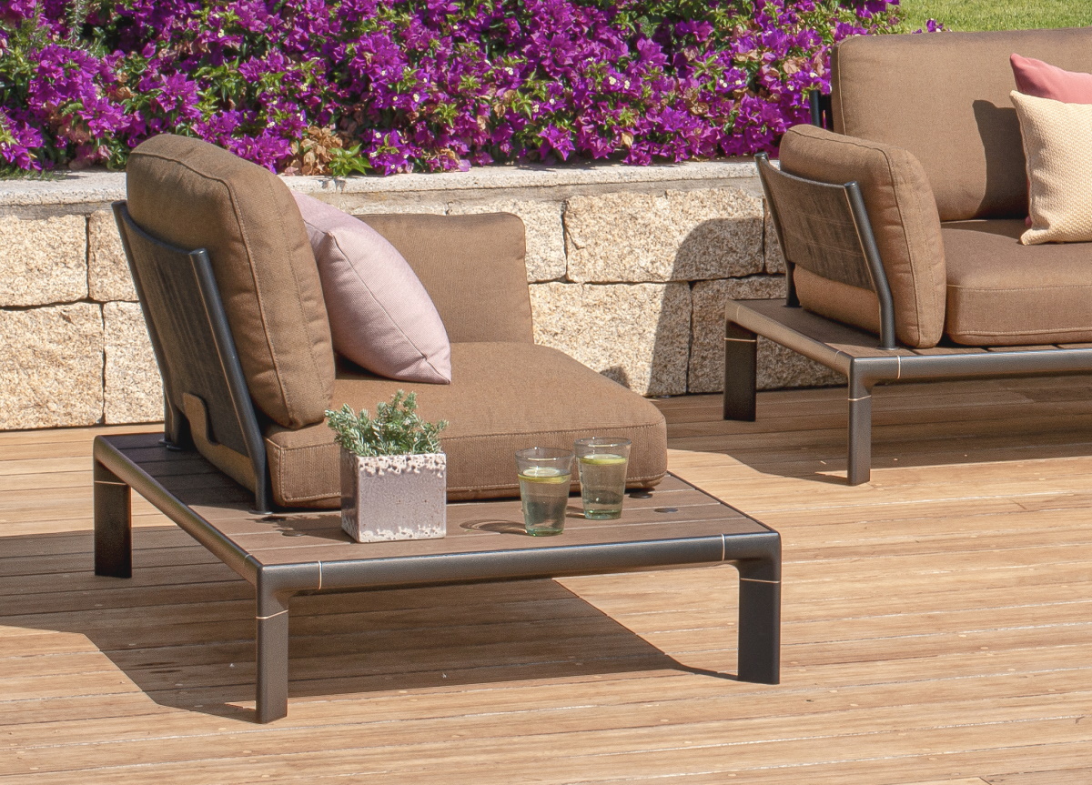 Each module has a powder coated aluminium frame in matt white or black. The base slats can be selected in either a natural Bamboo composite which has been treated for outdoor use, or Anthracite WPC a wood composite material that requires little maintenance as it is water and UV resistant, easy to clean, does not chip and is recyclable. The tubular aluminium seat backs and armrests in matt white or black easily connect into the base and have fabric inserts in white, brown, grey, or blue.