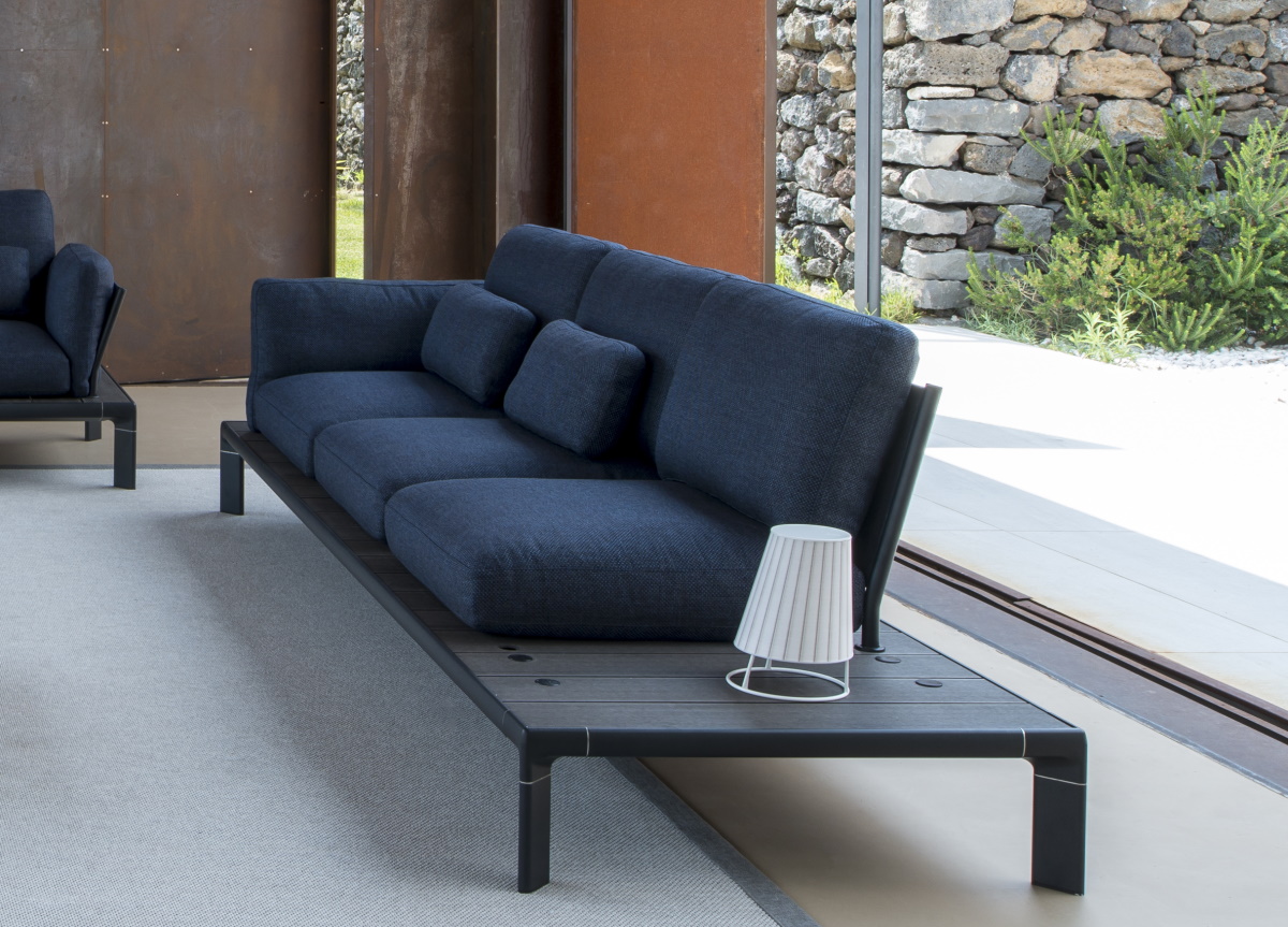 Each module has a powder coated aluminium frame in matt white or black. The base slats can be selected in either a natural Bamboo composite which has been treated for outdoor use, or Anthracite WPC a wood composite material that requires little maintenance as it is water and UV resistant, easy to clean, does not chip and is recyclable. The tubular aluminium seat backs and armrests in matt white or black easily connect into the base and have fabric inserts in white, brown, grey, or blue.