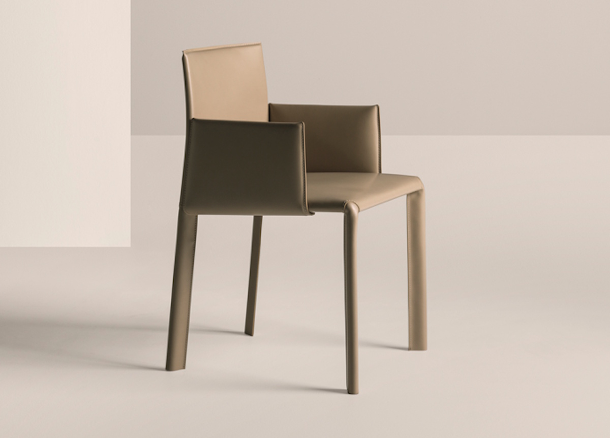 The Frag Blyn leather dining armchair by G. & O. Buratti has two supportive padded armrests as well as clean, simple lines giving a subtle elegance. Upholstered in saddle (hide) leather throughout, including the legs, Blyn features a comfortable and generously proportioned padded backrest. The leather upholstery is stitched and fitted by hand on the steel frame in the manner of a tailored suit.