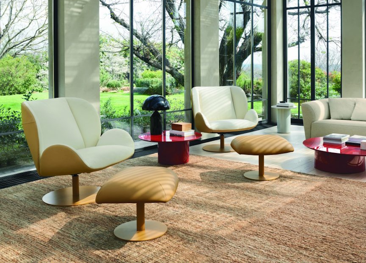 This comfortable armchair has a rigid moulded shell that contains and protects, accompanied by soft and generous ergonomic cushions that offer enjoyable relaxation and can be complemented with a footrest pouf for maximum comfort. The central swivelling steel base is lacquered in dark micaceous bronze, or on request it can be lacquered in a RAL colour of your choice.