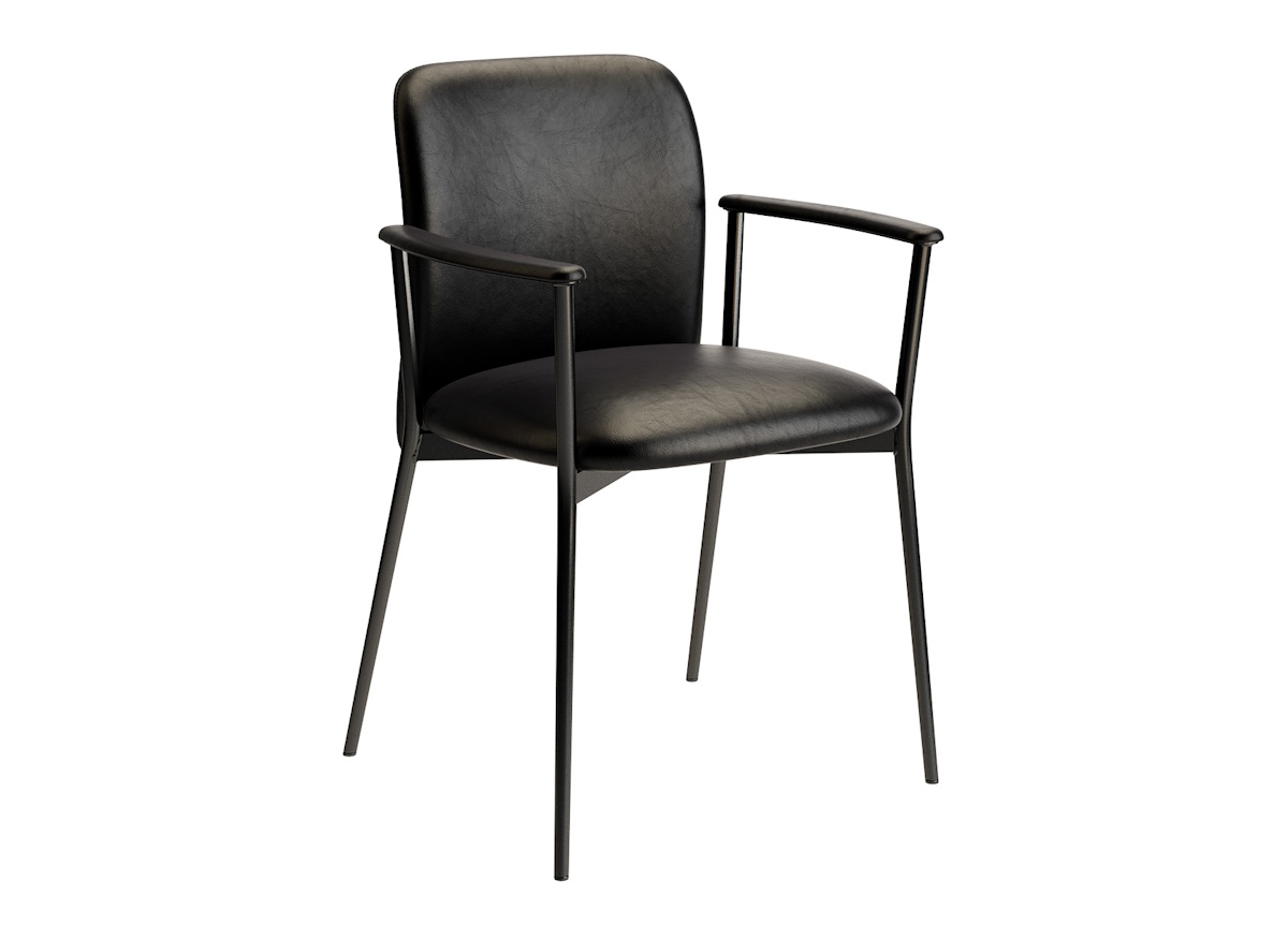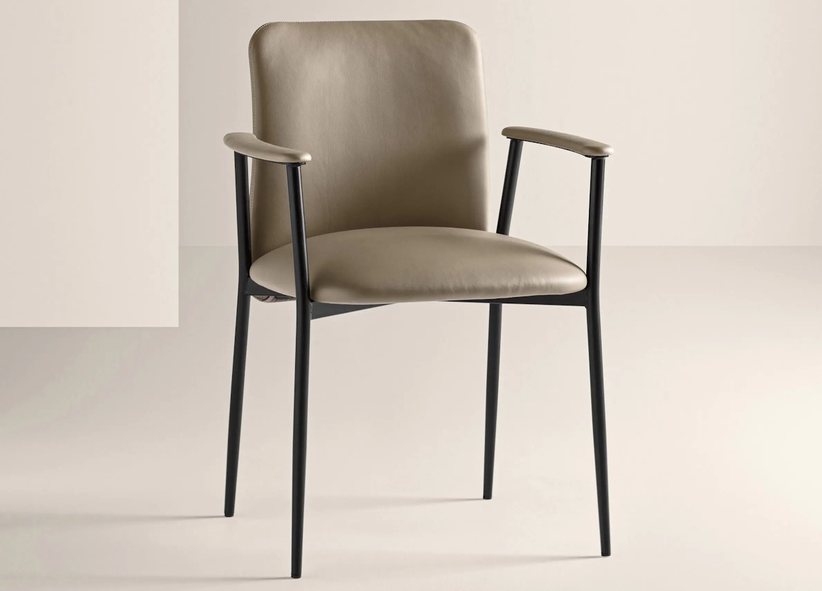 Part of the Siloe seating collection which also includes a dining chair without arms & a bar stool all of which feature a restrained and harmonious design. The entire range is distinguished by a soft seat supported on a frame in which the legs are linked in a cross design. The backrest joins the seat with an ironic curvature and extends beyond the seat as if to protect it. The legs of the armchair extend to create support for the distinctive gently curved armrests which are padded in the metal leg version.