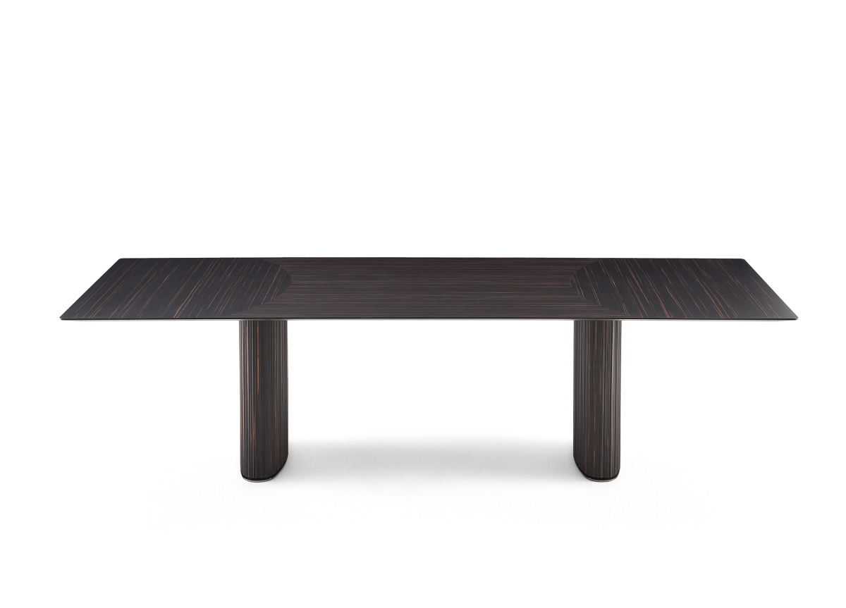 The Gallotti & Radice Shiro dining table designed by Oscar & Gabriele Buratti for luxury Italian Brand Gallotti & Radice has a distinctive contemporary curved inlaid wooden table top, or marble top, with two striking oval bases with black chromed detail.