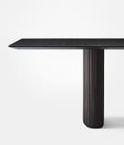 You have the option to select an Ebano Capri wood table top with an inlaid curve at each end, which matches the base finish, or choose from a choice of three natural polished marbles tops including Calacatta Vagli Oro. The two curved oval bases to the table are covered in solid milled Ebano Capri finished wood with black chromed metal details at the base.