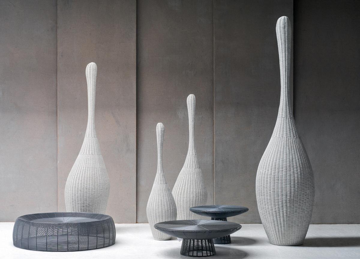 The Gervasoni Bolla floor lamps by Michael Sodeau are a family of lights made entirely of woven wicker in either a natural mélange finish or lacquered in matt white, grey, black, ocean, dove-grey, blueberry, date or ginger.