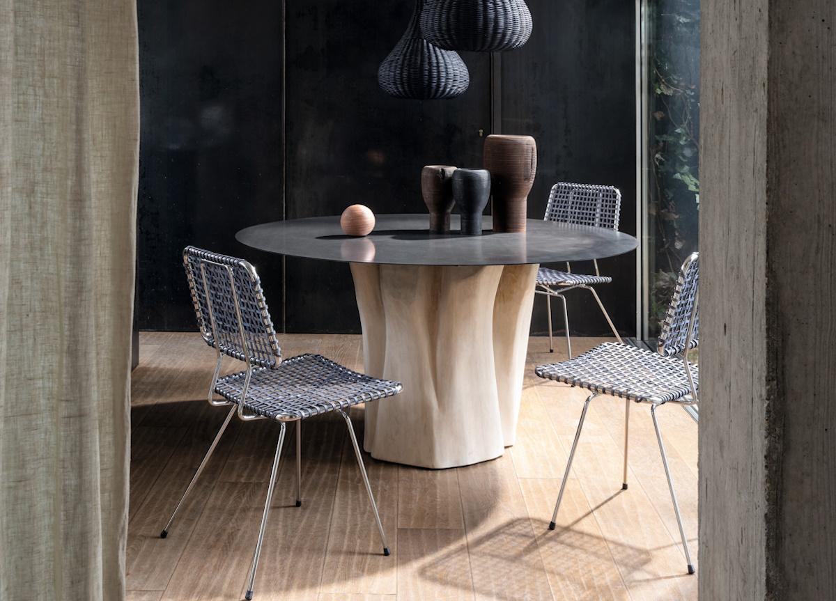 Available in two round and two rectangular sizes the Nordic references are evident in the base made from sections of natural debarked hornbeam trunk, which is a striking visual contrast to the thin waxed iron sheet table top.