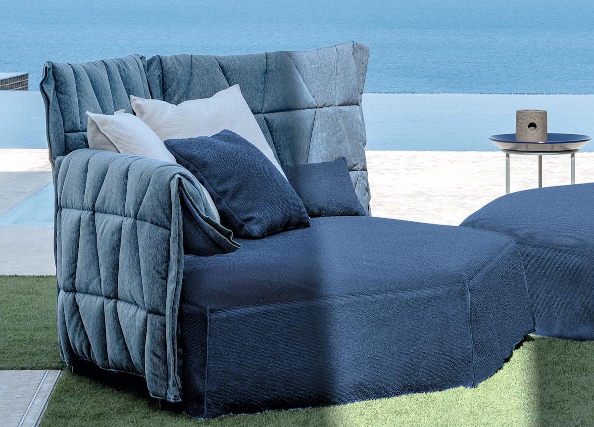 The sofa structure in steel, treated for outdoors, combines with the softness of the seating cushions in polyurethane foam in variable density and polyester fibres, covered with polyester outdoor canvas and non-slip breathable bottom. Flair is, therefore, able to combine a mechanical part composed of straps and hinges carefully studied in every functional and aesthetic detail, with a textile part, designed to highlight the special workmanship of Gervasoni's fabrics, and their ease in being unlined to cover each component like a tailored suit.