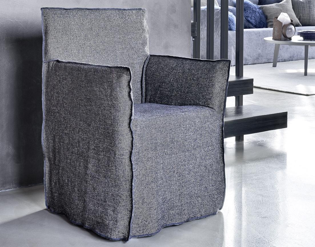Ghost has a thin, minimal padded structure with visible stitching around the seat and arms. The main feature of the whole Ghost collection are the loose-fitting removable covers which can be put on and taken off in a flash allowing you to change the chairs appearance with a different colour or pattern creating a formal or informal look with ease and speed.