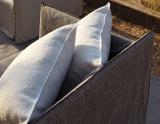 Ghost outdoor armchairs have armrests and backs which are separated from the seat to allow the water to drain and avoid the build-up of moisture. Likewise, the padding and upholstery fabrics have been specifically developed to resist against water and sunlight. The perfect water-repellence of the polyurethane foam padding is guaranteed by the polyester cushion covers, treated with specific waterproof and water-repellent products and with heat welded seams.