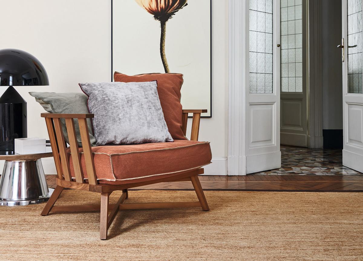 This extremely comfortable chair has low backrest with an enveloping design and wooden slats that create an interplay of solids and voids, a pleasant contrast between the minimal frame and the softness of the optional seat and back cushions. The optional cushion set comprises of one seat cushion and three back cushions in two sizes.