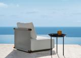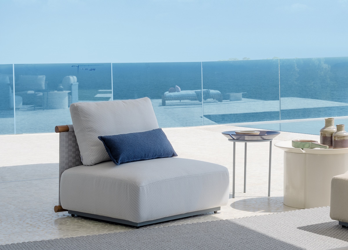 Wrapped around the iroko backrest creating ergonomic support is blue or beige Accardi Outdoor Jacquard technical fabric which is a sustainable, lightweight, waterproof fabric carefully crafted by artisan weavers. The result creates a textured pattern that blends harmoniously with the wooden structure with irregular cross-section, once again highlighting the reference to Japanism and the local craft tradition.