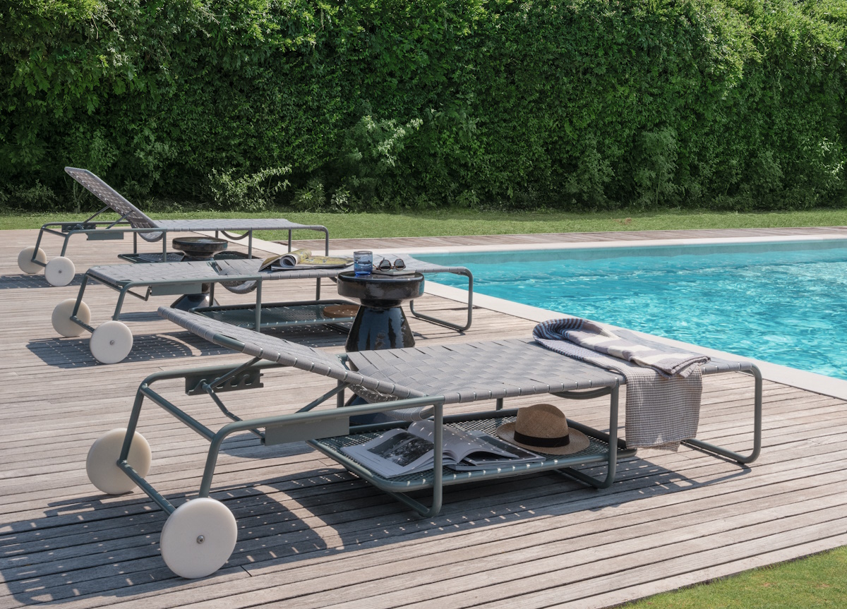The strong but lightweight frame can be selected in several colours of painted embossed tubular aluminium, an ecological material, unique for its technical qualities. The frame is then woven with either grey, black, tobacco or blue elastic strap, an innovative product based on synthetic rubber and propylene. Please note that the weave is slightly different for each style of lounger.