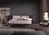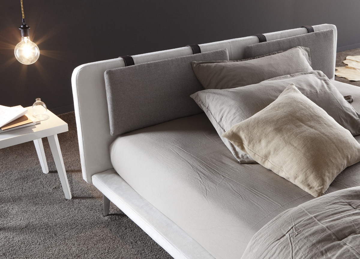 Available in a huge range of fabrics, as well as several types of leather (including Nubuck), ecoleather (a high quality faux leather), or even covered in one of our many Romo fabrics (we have stain resistant options), or your own fabric. Please note fabric covers are fully removable but leather/eco leather headboard covers are not. The extra cushions can be finished with different upholstery to the bed and can be removed and washed separately.||The main picture shows Kyros in Tecnonabuk (category B) fabric - colour 806, with satin aluminium Magic feet. The large headboard version (lights not included) has Ark chrome finish feet and upholstery in Eco-leather (category B) - colour 16.