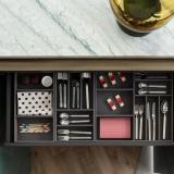 LEMA's attention to detail is also evident in the internal finish which is in grey velvet melamine, an innovative ultra-matt material, highly resistant, yet velvety smooth to the touch. There are two grey smoke tempered glass shelves, as well as optional cutlery trays or dividers in grey ecoleather.