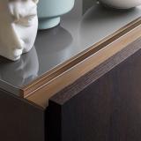 Made in Italy, the four door Florens sideboard has an almost monolithic shape and features a striking painted bronze metal profile carved flush on the top, partly hidden from view by the front panel and which forms the groove that functions as the door handle.