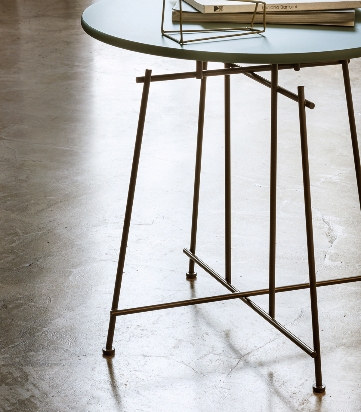 The table legs are made from 10mm steel rods which are bronze lacquered and welded both vertically and horizontally. The table top is wood which is matt lacquered in a vast range of colours. To see the colours online, please click here.