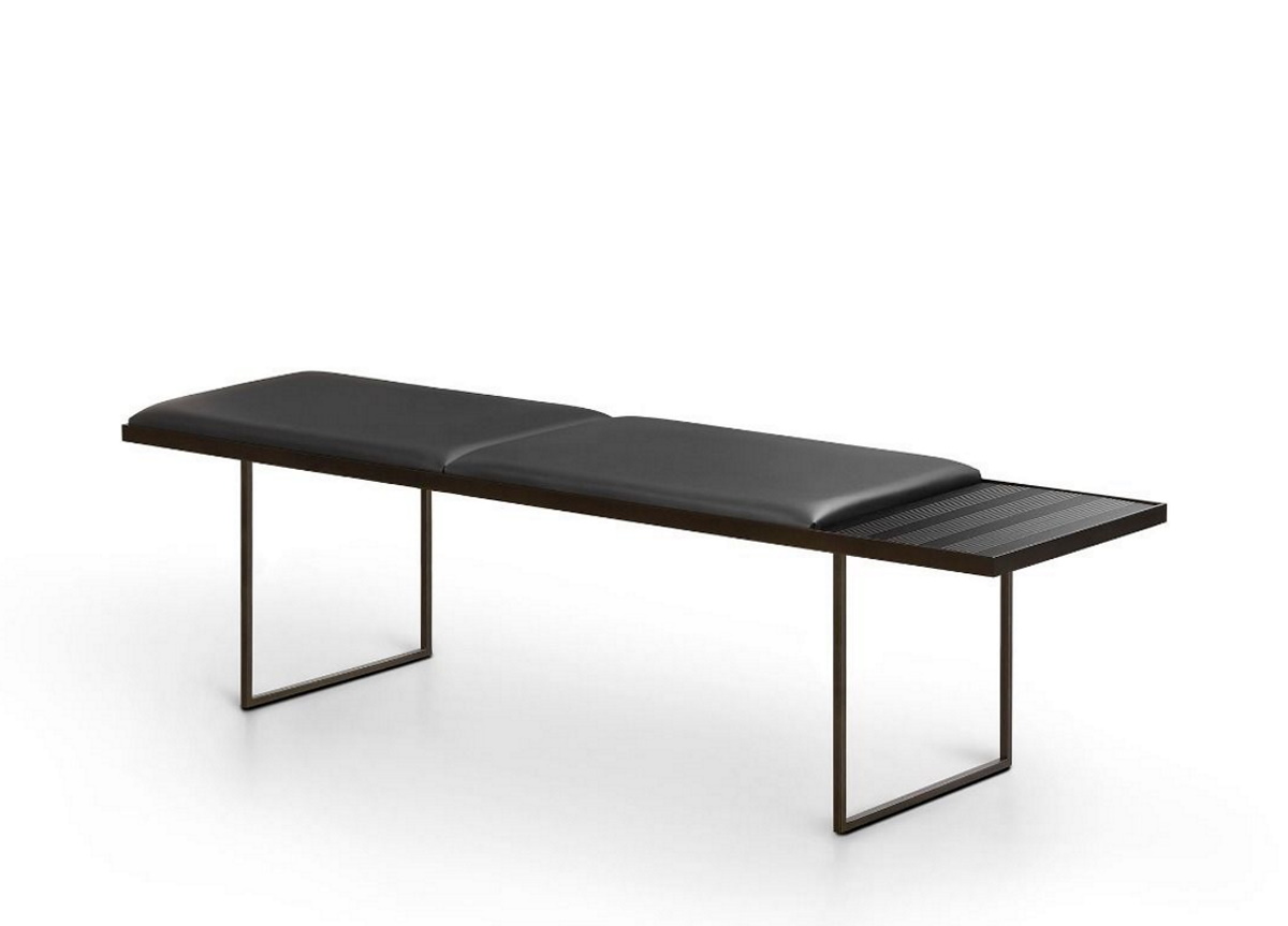 The frame is in bronze painted metal with a padded double cushion in either leather or ecoleather. The cushion can be positioned at the side, or centrally, and in this space there is a heat treated oak tray which is integrated into the frame, with millerighe inserts, designed as a container for small objects. Cushion covers are not removable.