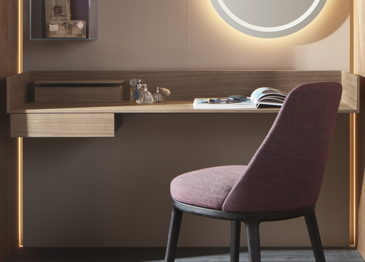 Designed by David Lopez Quinconces, the Vanity dressing table is a wall hung element which is suspended from a back-lit panel creating a refined and welcoming place for make-up, or a discreet and secluded corner for smart working,