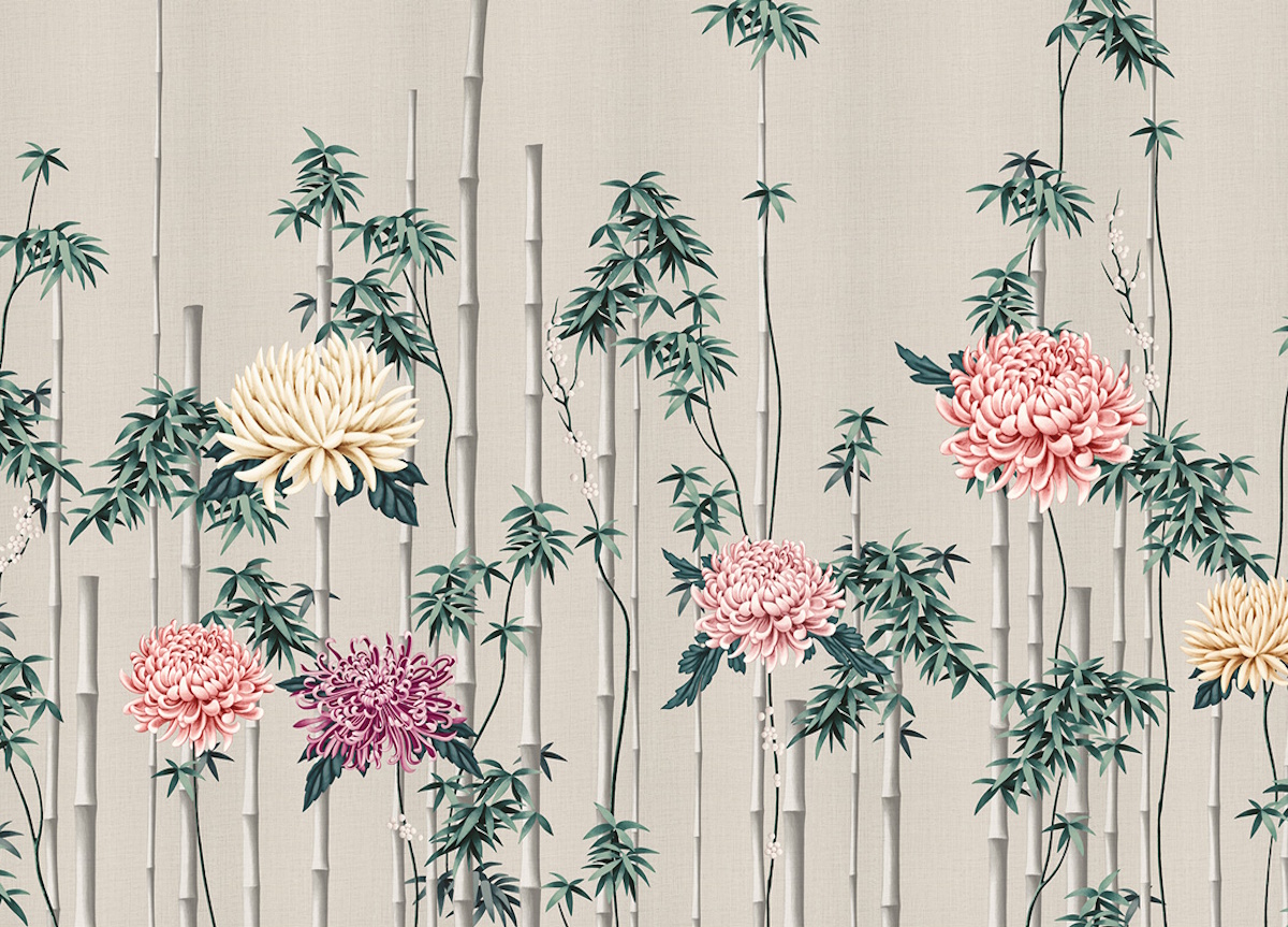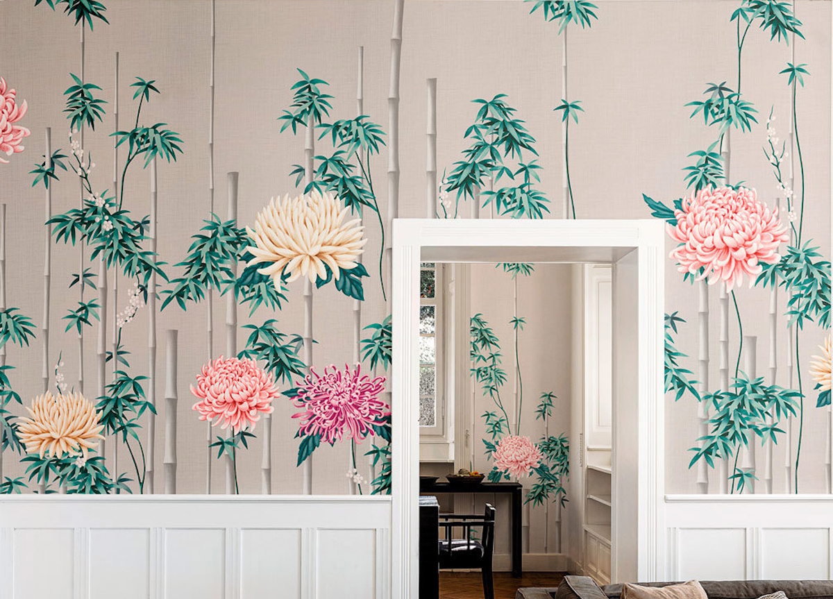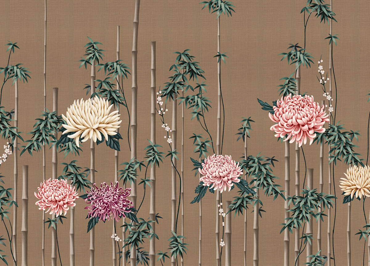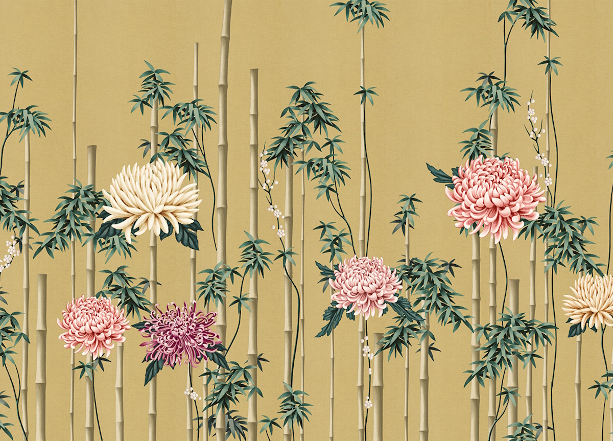 Fuki wallpaper from luxury Italian wall-covering brand London Art blends the art of design with the mastery of painting and features elegant flower arrangements of bamboo and chrysanthemum, with the latter representing immortality, as, being a hardy perennial plant, it overcomes the adversities of the cold. Available in five different background colours, you can choose from gold, silver, black, caramel, or white.