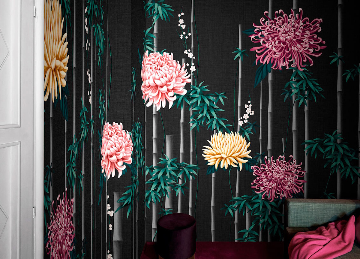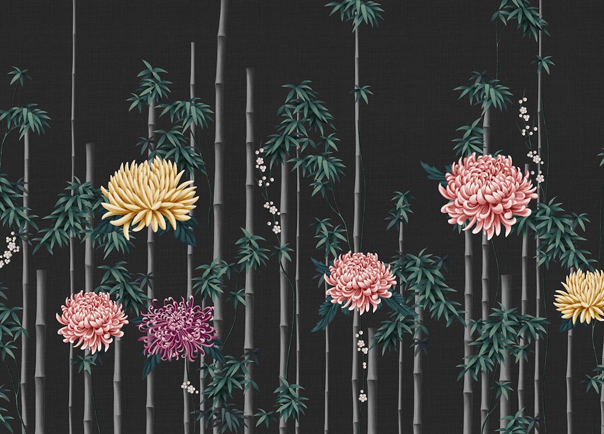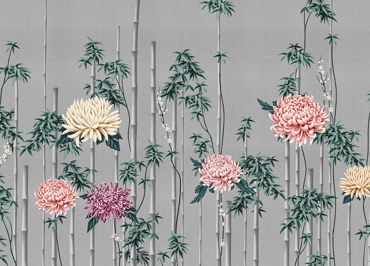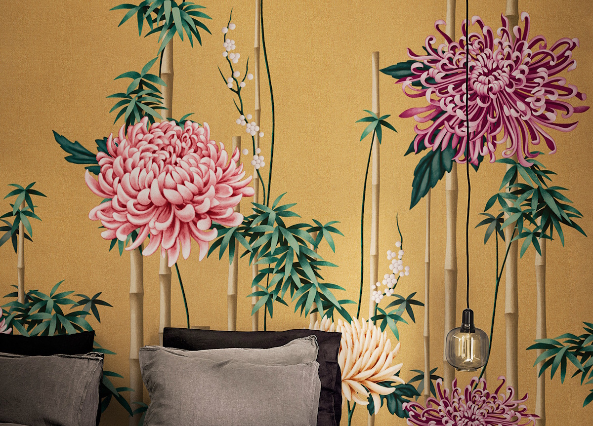 Fuki wallpaper from luxury Italian wall-covering brand London Art blends the art of design with the mastery of painting and features elegant flower arrangements of bamboo and chrysanthemum, with the latter representing immortality, as, being a hardy perennial plant, it overcomes the adversities of the cold. Available in five different background colours, you can choose from gold, silver, black, caramel, or white.