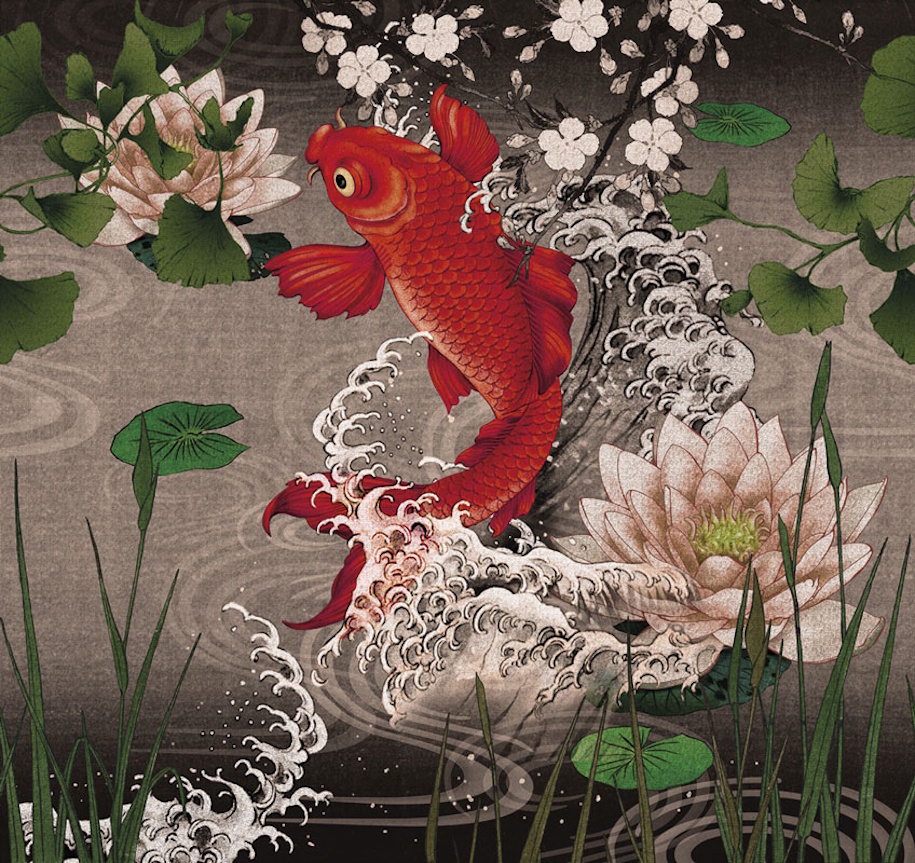 Designed by Francesca Besso & made in Italy by luxury wallpaper brand London Art Koi features an elegant koi carp swimming gracefully surrounded by water lilies and flowers, creating a soothing, harmonious atmosphere in a sophisticated traditional Japanese art style combined with modern practicality.