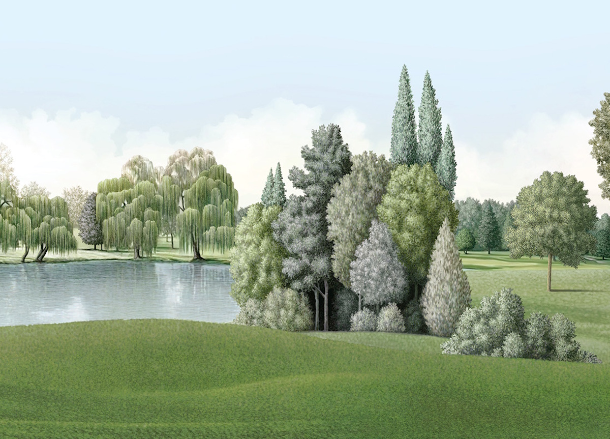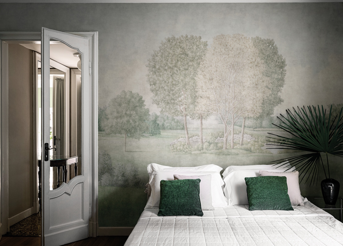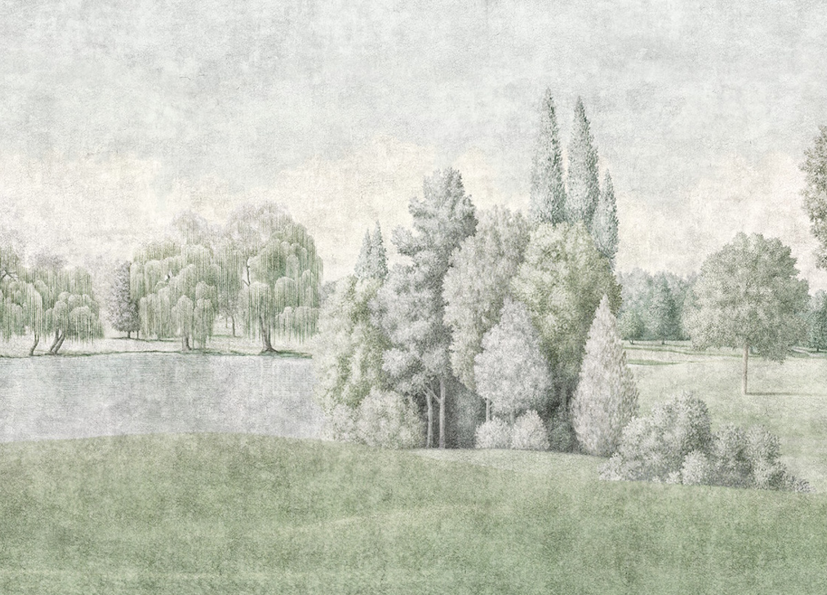 By blending the art of design with the mastery of painting, this elegant wallpaper conveys a sense of calm, sophistication, and escapism, as if the room opens directly onto a peaceful park landscape.