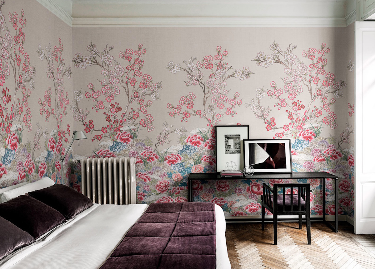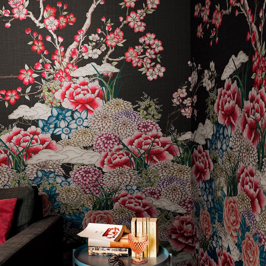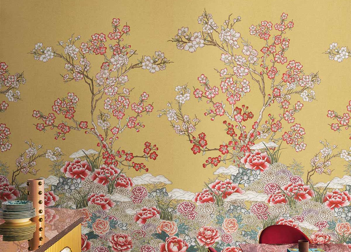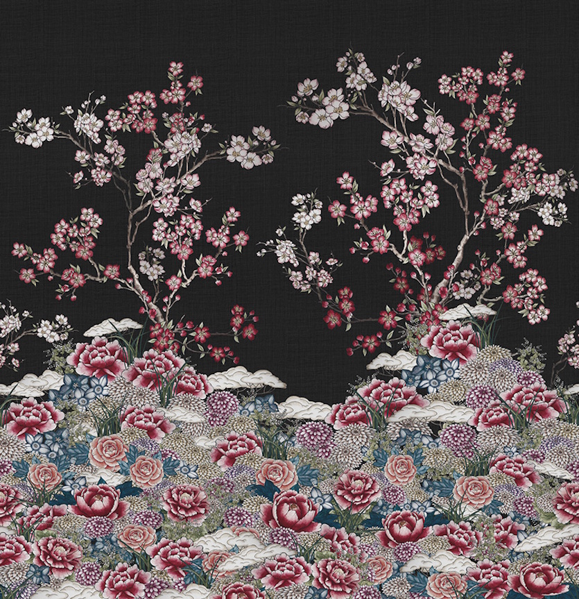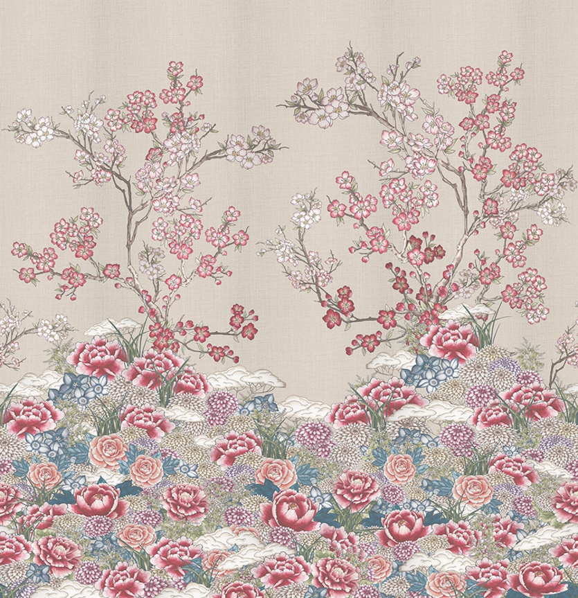 The simply stunning Zori wallpaper from the Kimono collection by Nicola Bottegal for luxury wallpaper brand London Art is a triumph of hand-drawn blooms & blossoms featuring cherries, camellias, & peonies, all flowers dear to Japanese traditions with a strong symbolic meaning. Inspired by the classic designs of sliding doors and the motifs that make up traditional kimonos.