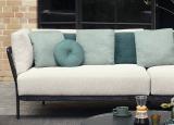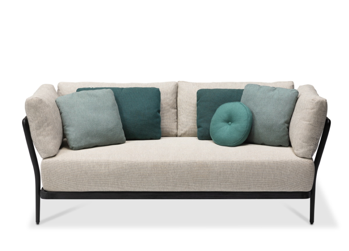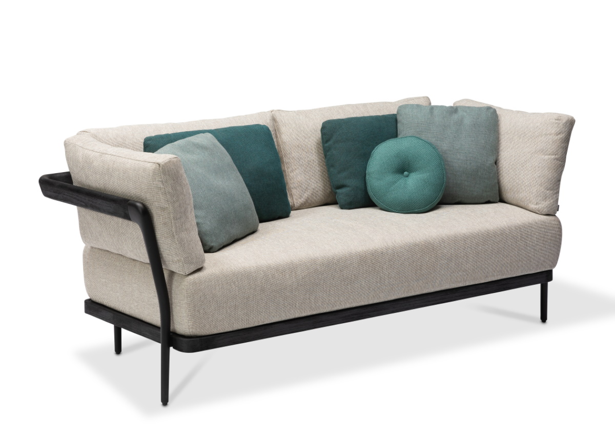 The light and elegant aluminium frame features hand-crafted wooden finishes for the armrests and base in either natural teak or brushed teak nero. Oval shaped legs add a unique style, turning each sofa into a one-of-a-kind piece, designed to be admired for years to come.