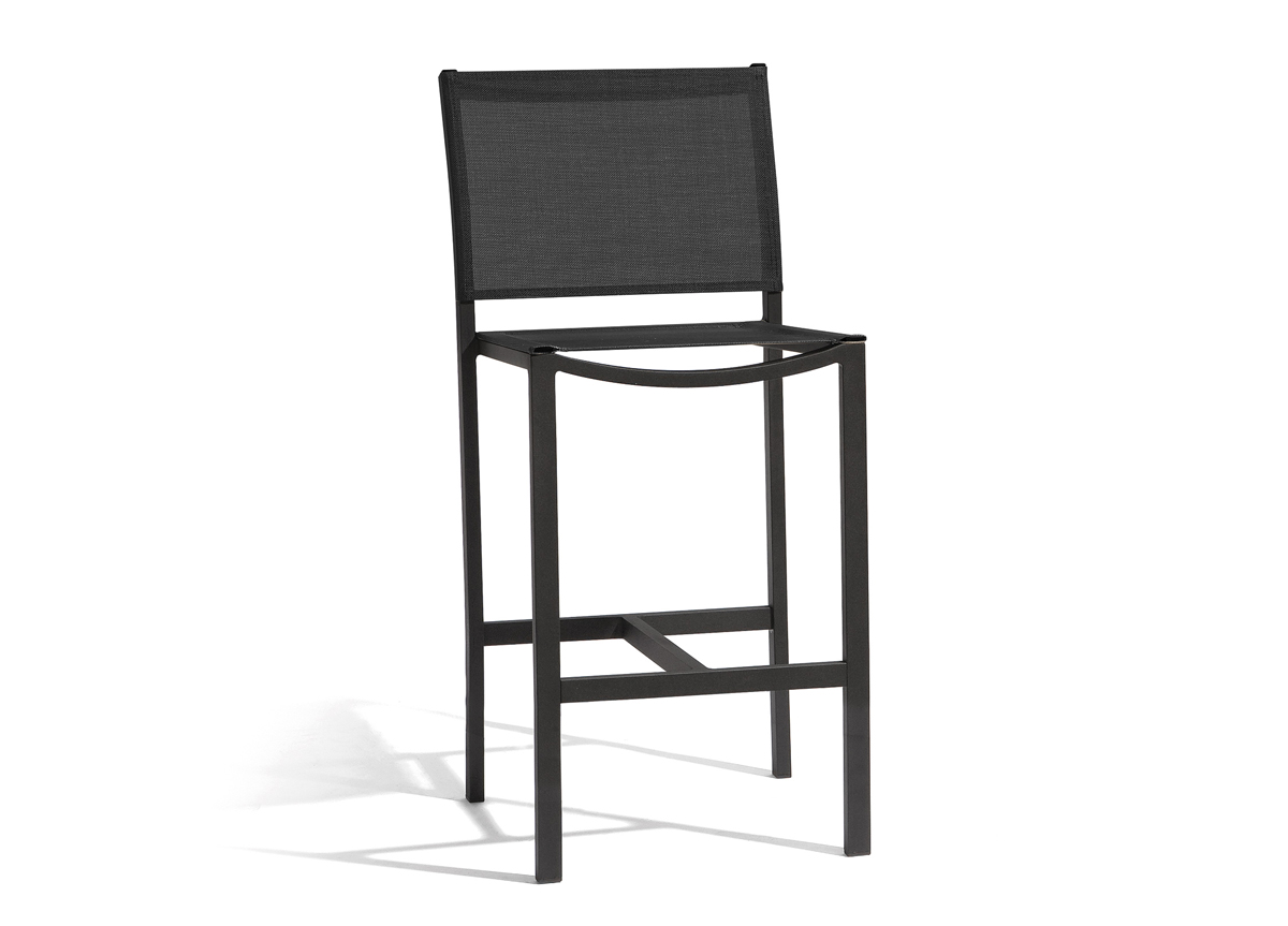 The Manutti Latona garden bar stool by Stephane De Winter from Manutti has a simple but sturdy powdercoated aluminium frame. The seat and back are in a comfortable, waterproof, all weather textile.