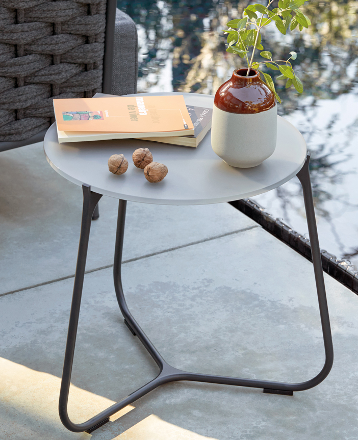Available in two sizes, the Mood side table has a powder coated aluminium frame which can be selected in white, lava or flint.