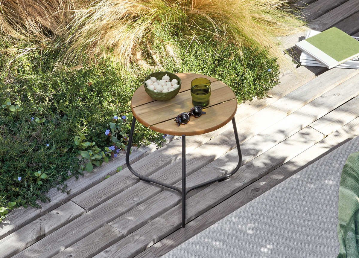 The Manutti Mood garden side table by Gerd Couckhuyt is part of the Mood collection of contemporary outdoor furniture which includes several chairs, a coffee table and a bar stool. Made in Belgium.