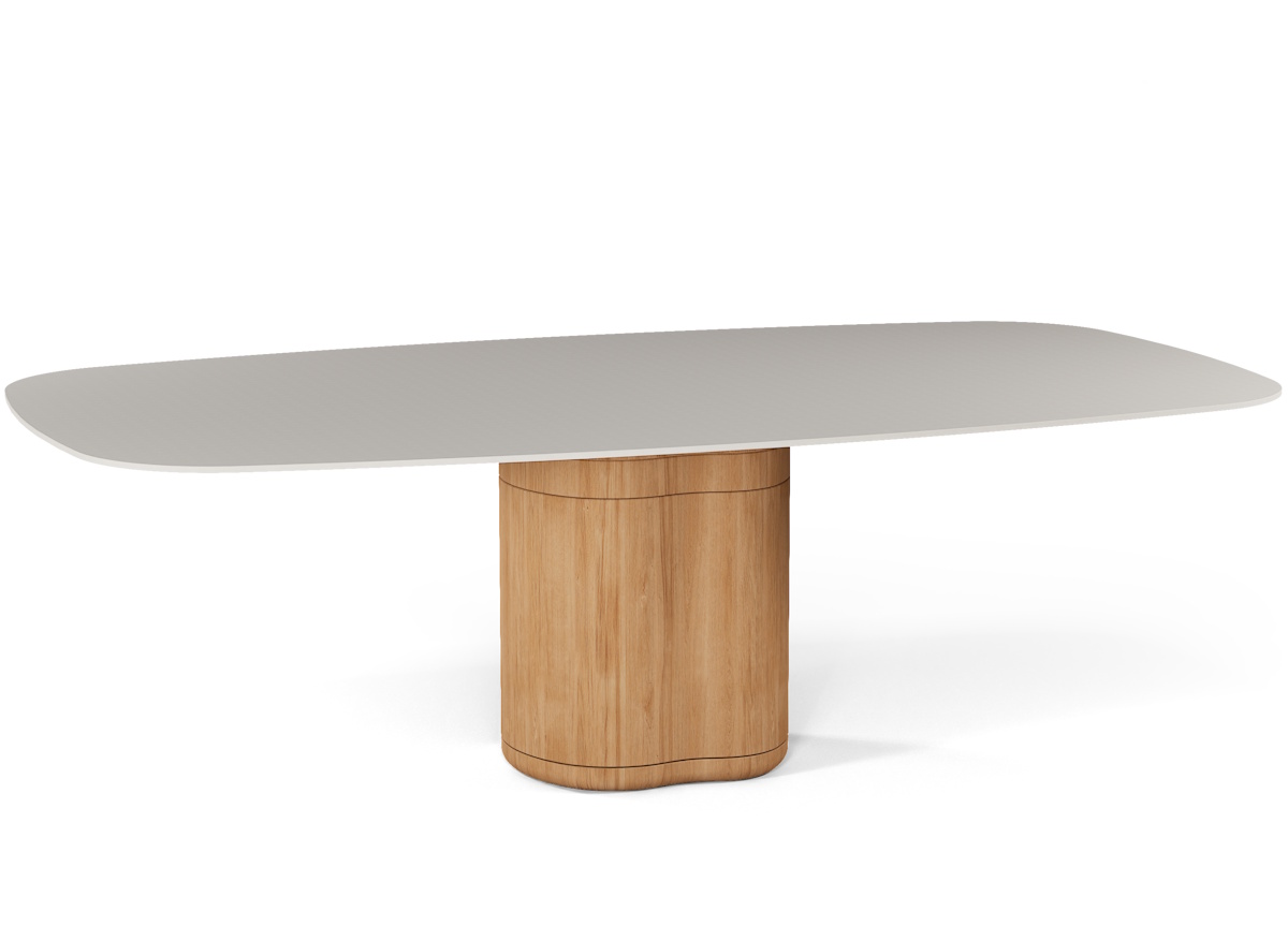Inspired by natural forms, the table features a softly tapered, boat-shaped silhouette that enhances interaction and creates a natural flow around the setting. Available in two sizes, 230cm & 280cm, the table top can be selected in either brushed teak or several durable, hard-wearing ceramic finishes, it is supported by a central sculpted wooden base that provides optimal leg space and visual lightness.
