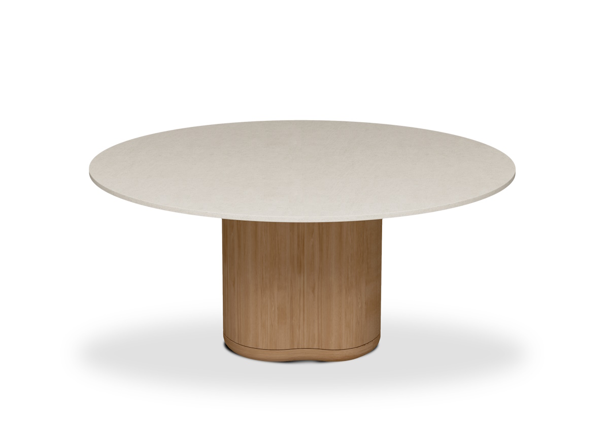 The elegant circular table top is available in three sizes and is combined with a beautiful sculpted wood base that enhances the tables natural appeal. The two smaller sized tables (125cm & 148cm) have a table top which can be selected in a range of 12mm thick ceramic finishes in several subtle shades for a refined modern touch, whilst the larger sized 160cm diameter table has a table top in brushed teak for a warm natural look.