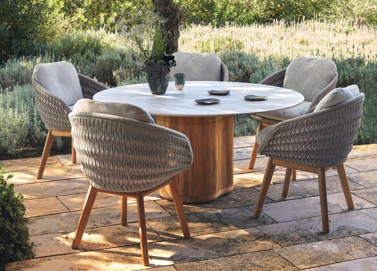 The Manutti Ogado round garden dining table by Brent De Meulenaere is available in three sizes and is perfect for intimate outdoor settings with its elegant circular table top and beautiful sculpted wood base that enhances the tables natural appeal.