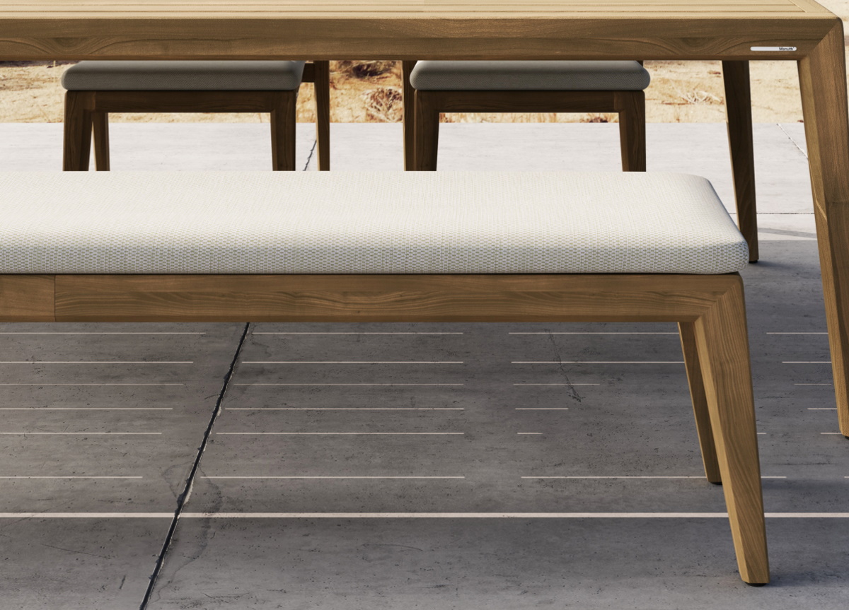 Bench made from solid Teak wood in either brushed teak or teak scuro. Protective cover available.