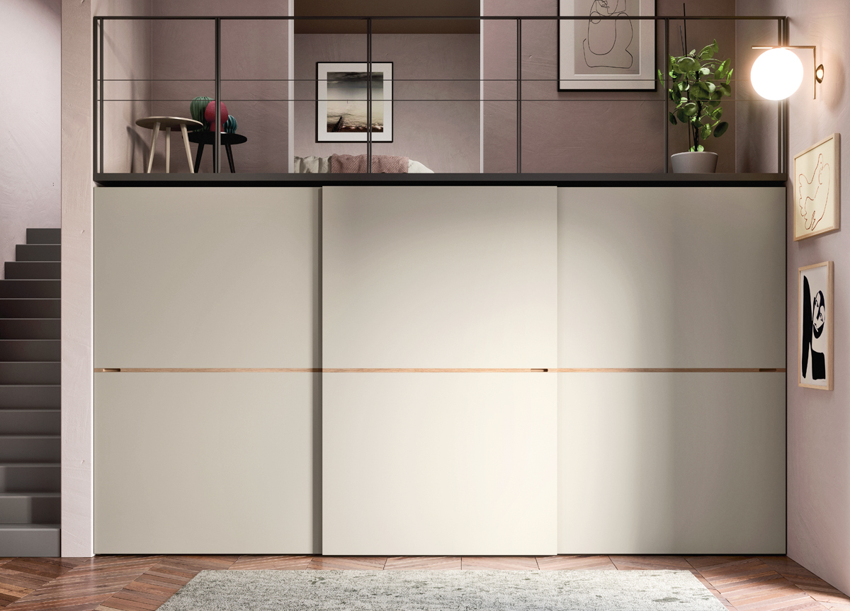 The Middle sliding door wardrobe from Italian brand Novamobili has a horizontal strip insert in the doors with recessed handles.